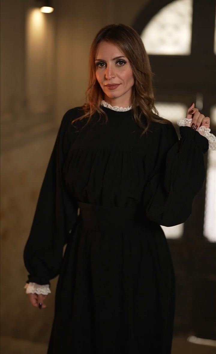 The fabric is ribbed velvet with lace on the sleeves with elasticated waist collar.